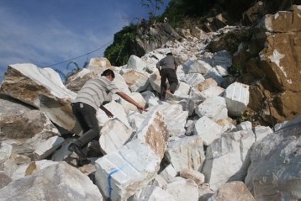 Khi đến khu vực khai thác đá, một nhóm người ngồi trên lưng chừng núi thi nhau khoan, đục những phiến đá to bằng cái bàn. Một lát sau tiếng máy khoan lặng đi nhường chỗ cho tiếng lăn cùng cục chát chúa phát ra từ những viên đá va đập vào nhau. Thấy đá lăn dữ quá, một nhóm phu đá chừng năm người đang đi dưới chân núi hò nhau chạy tán loạn rồi núp sau những mỏm đá to hơn, đề phòng đá lăn vào người.